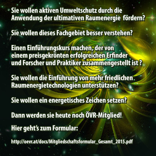 Als Vereinigung mit gemeinnütziger wissenschaftlicher Zielsetzung können Sie die Österreichische Vereinigung für Raumenergie (ÖVR) als Mitglied u.a. mit einem jährlichen Beitrag von € 150,– unterstützen. (Beitragsreduzierung z.B. für Studenten Pensionisten, Aquapol-Kunden oder bei Mithilfe in der Vereinsarbeit möglich)