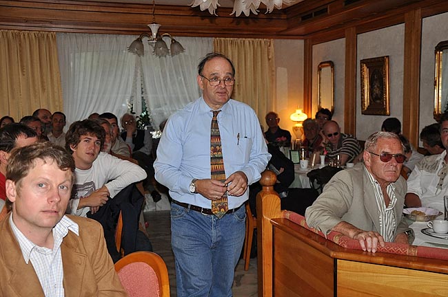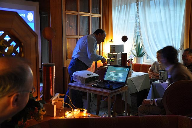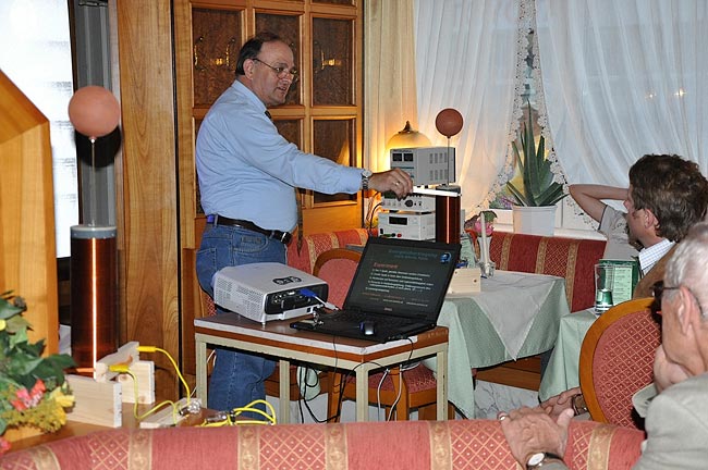 Den Abschluss der Exkursion bildete ein Vortrag von Ing. Norbert Willmann im gleichen Gasthaus, wo bereits zu Mittag gegessen wurde. Vortragsthema war das Experiment der HTL Wels zur "fast" drahtlosen Energie-Übertragung nach Tesla auf größere Distanz (bis 120 Meter) und auch die neueste Erkenntnis hierzu (PDF auf der Willmann-Homepage). Nur "fast" deshalb, weil Hr. Willmann eine Verbindungsleitung dünner als ein Kopfhaar zur Übertragung von einigen 100 Watt verwendet, aber Tesla selbst für die Übertragung weit höherer Energie keine direkte Drahtverbindung mehr zwischen Sender und Empfänger benötigte! Herr Willmann schreibt in seiner physikalischen Erklärung (www.nw-service.at/zip/physikalisch-erkl.zip ) selbst, dass Tesla´s Übertragung auf anderen Grundlagen basierte."