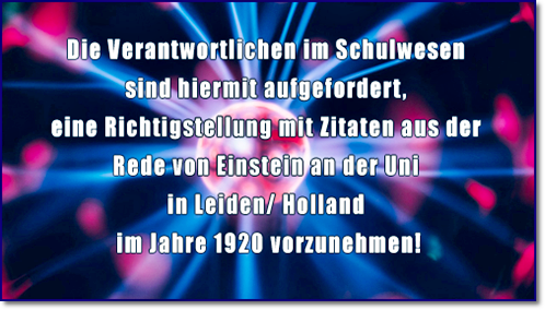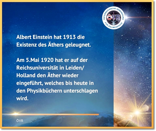 Immerhin hat er 1920 auf der Universität in Leiden/Holland bei seinem Vortrag den Äther wieder in seine Relativitätstheorie eingeführt.