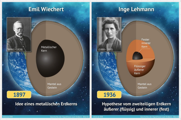Von der ersten Idee eines metallischen Erdkerns folgten weitere Hypothesen, die dann fürs Erste beim zweiteiligen Erdkern 1936 von Inge Lehmann landeten. Abwechselnd waren die Erdkerne mal fest und mal flüssig.