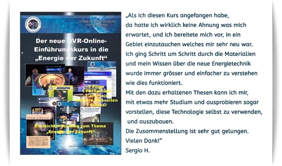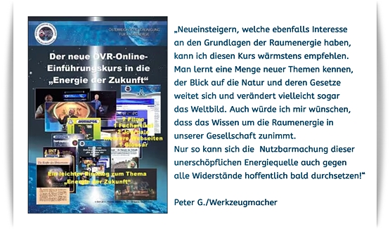 Der ÖVR-Einführungskurs in die ultimative Energie der Zukunft - Unterlagen für Mitglieder frei zugänglich – sonst gegen eine Spende, unterstützt die Verbreitung der Raumenergie. „Jemand, der kaum über dieses Thema Bescheid weiß, wird es nicht gerne weitererzählen, um nicht ausgelacht zu werden“ so bin ich überzeugt. Eine gute Bildung in diesem Fachgebiet, einfach verständlich aufbereitet, verbessert dieses Manko im Gebiet der Raumenergie.