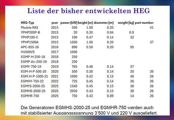 Auch das konkurrenzlose Gewicht von 14kg bei einem 750kW-Stromgenerator kann sich absolut sehen lassen. Aus meiner gesamten Sicht ist diese Technologie von Marukhin, was die Energieerzeugung/-wandlung in Bezug auf deren Volumen angeht, unschlagbar.