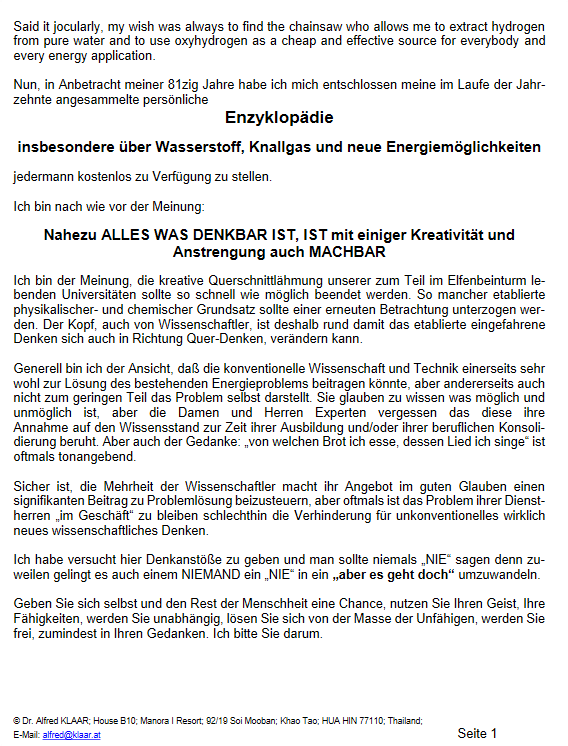 Ein langjähriges ÖVR- Mitglied Dr. Alfred Klaar, der die fast 1000 Seiten!!!! lange Enzyklopädie, insbesondere über Wasserstoff, Knallgas und neue Energiemöglichkeiten geschrieben hat, hat nun das nächste Patent in der Schweiz angemeldet. ?